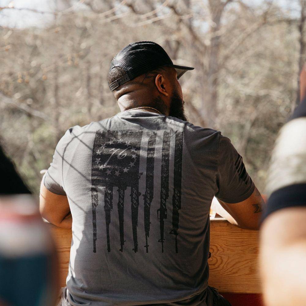 There is nothing that screams America more than the original American flag with some guns! Our Betsy Rifle flag shirt features an original United States of America flag including rifle barrel stripes and a circle of thirteen stars, to honor the original colonies, on the front left chest, making it the most patriotic shirt you’ve ever seen. So what are you waiting for? Add this badass shirt to your cart today and wear it proudly, as a true American patriot should!