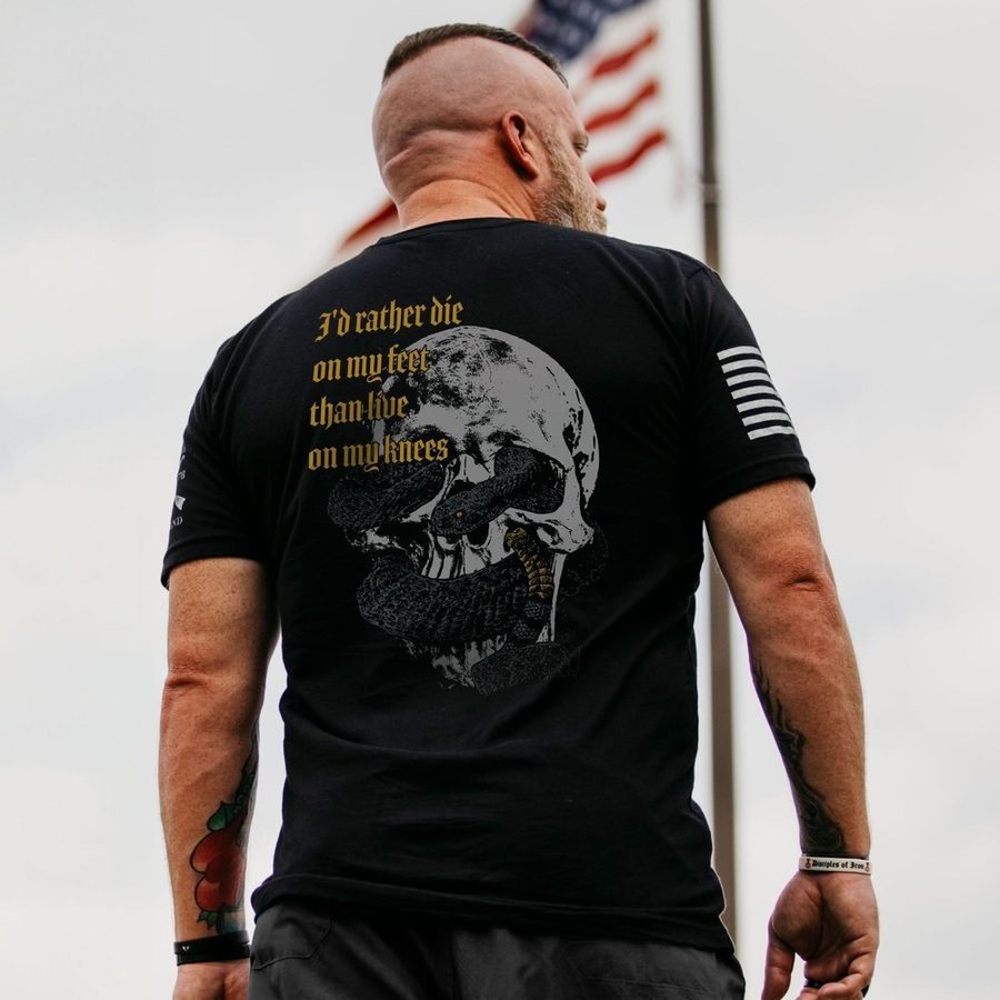 The Die On My Feet T-Shirt in Black is for those who live with spine, speak with fire, and refuse to bow to anything but the truth. Inspired by the battle cry of the brave—“I’d rather die on my feet than live on my knees”—this tee is a tribute to the fighters, the freedom-lovers, and the ones who don’t flinch when the heat’s on.