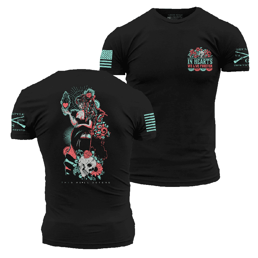 Show your appreciation for the loved ones who have gone before us with our In Hearts We Live Forever T-Shirt. Featuring a Día de Muertos design, this shirt is a strong reminder that those we love remain with us forever, in our hearts. Honor their memory, and celebrate life!