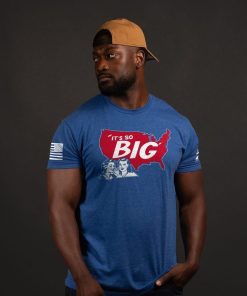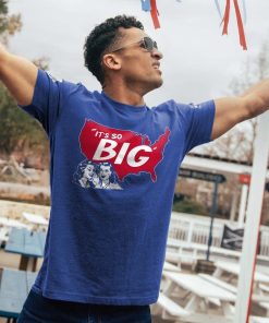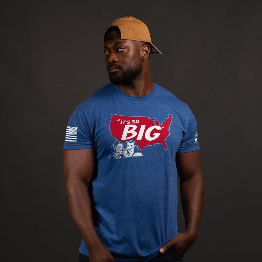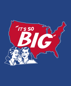 The It So Big T-Shirt in Royal takes playful gossip to patriotic heights, featuring a vintage-style illustration of two women whispering about the real star of the show: the massive, glorious map of the U.S. of A.