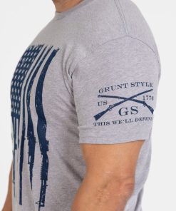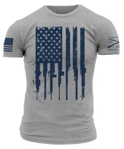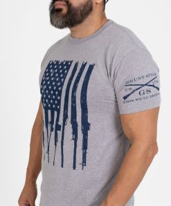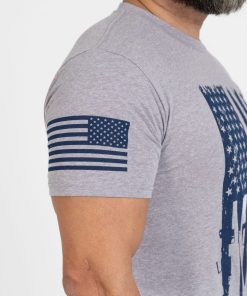 The Rifle Flag T-Shirt in Dark Heather Gray is a salute to the warriors, patriots, and defenders of the US of A. Old Glory stands tall with rifles for stripes—a bold reminder that our freedom is guarded by grit, steel, and the will to fight. The dark heather gray color gives it that rugged, battle-worn look, while the classic fit keeps you ready for anything from the range to the backyard BBQ.