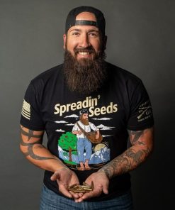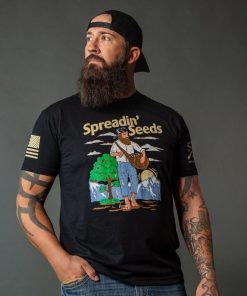 The Spreadin’ Seeds T-Shirt in Black is for those who know that liberty isn’t just a concept—it’s something you plant, nurture, and watch grow. Loud, proud, patriotic, and ready for action—just like you. This Grunt Style twist to a classic, Johnny Appleseed, is a popular figure in American folklore, a tall tale character embodying a wanderer who planted apple orchards across the frontier.